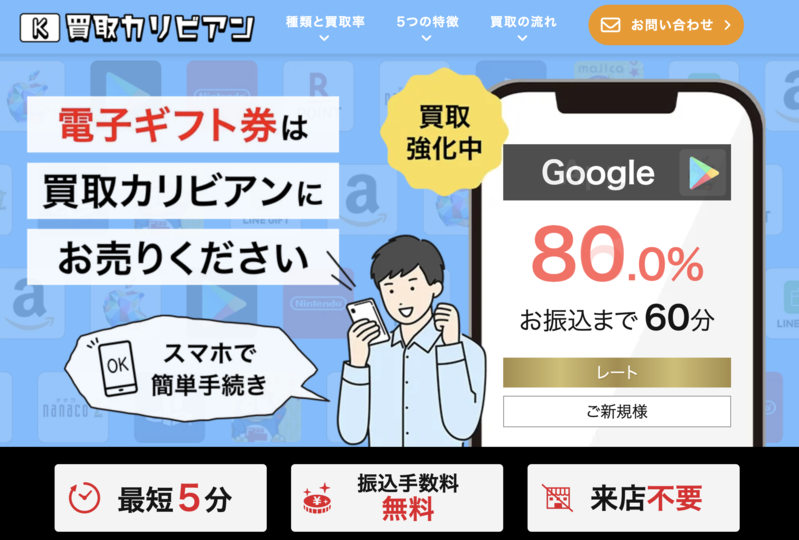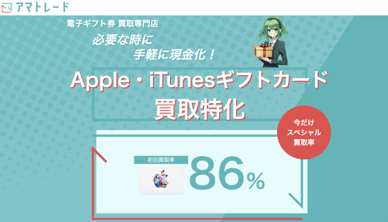 Amazonギフト券やAppleギフトカードなどの電子ギフト券を買い取り、即日現金化できるオンラインサービスです。